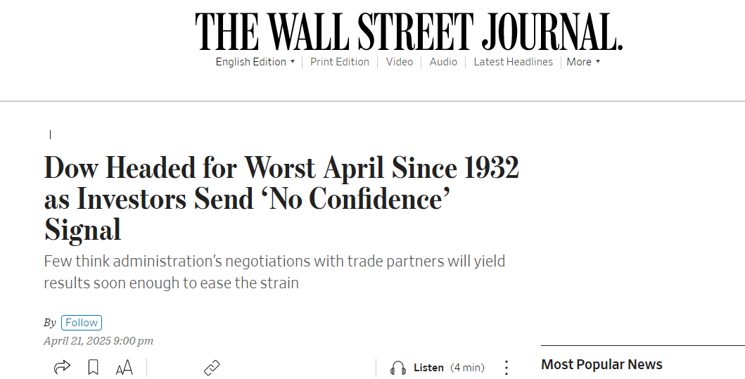 另據(jù)《華爾街日報(bào)》4月21日報(bào)道,道指或?qū)?chuàng)下近百年來最差4月表現(xiàn),投資者發(fā)出“不信任”信號。