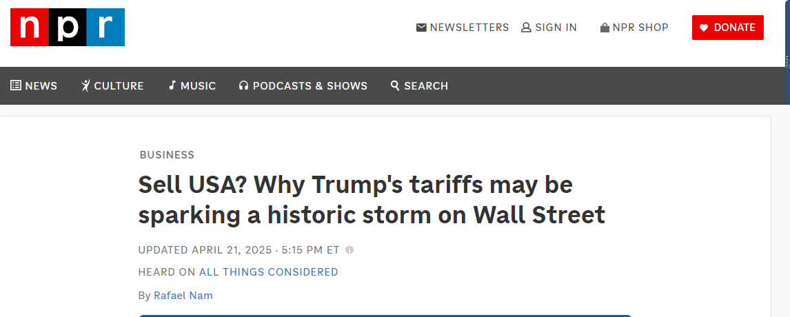 據(jù)美國國家公共廣播電臺(NPR)網(wǎng)站4月21日報(bào)道,美國金融體系過去被視為全球最穩(wěn)定和強(qiáng)大的體系之一。然而,由于美國現(xiàn)任政府4月2日推出的所謂全球“對等關(guān)稅”政策,美國金融市場出現(xiàn)了前所未有的危機(jī):全球投資者可能因美國政策的不確定性而對美國失去信心。