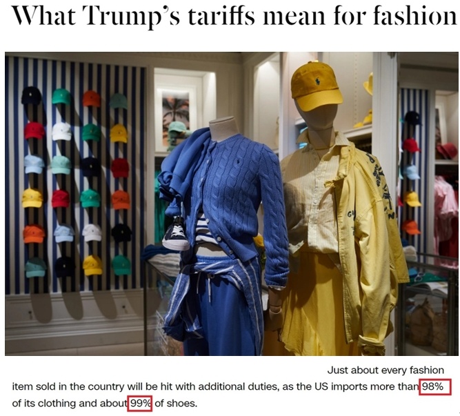美國有線電視新聞網近日刊發(fā)文章指出,關稅政策對服裝行業(yè)的影響尤為嚴重,因為美國人衣櫥里98%的衣物和99%的鞋子都是進口的。