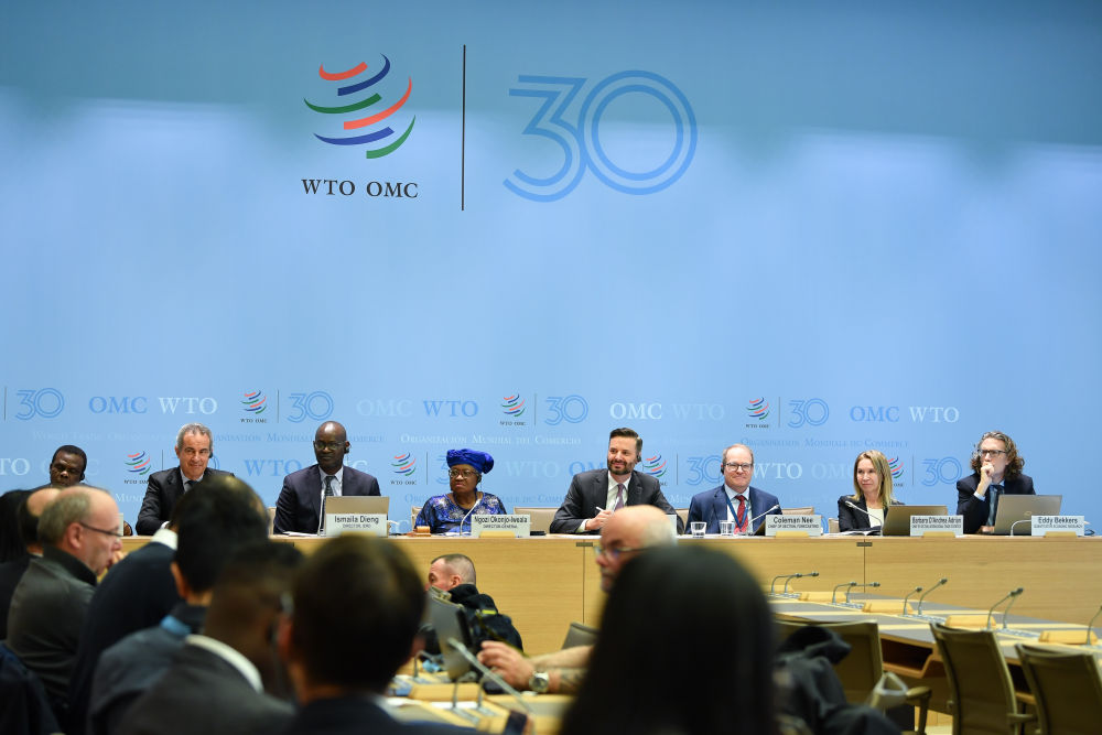 4月16日,在瑞士日內瓦世界貿易組織總部,世貿組織總干事伊維拉(后排左四)出席新聞發(fā)布會。世界貿易組織16日發(fā)布的最新報告顯示,美國關稅政策導致全球貿易前景嚴重惡化。新華社記者連漪攝