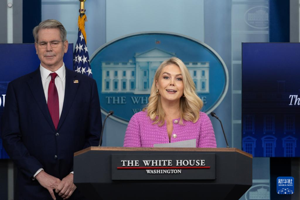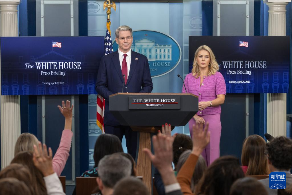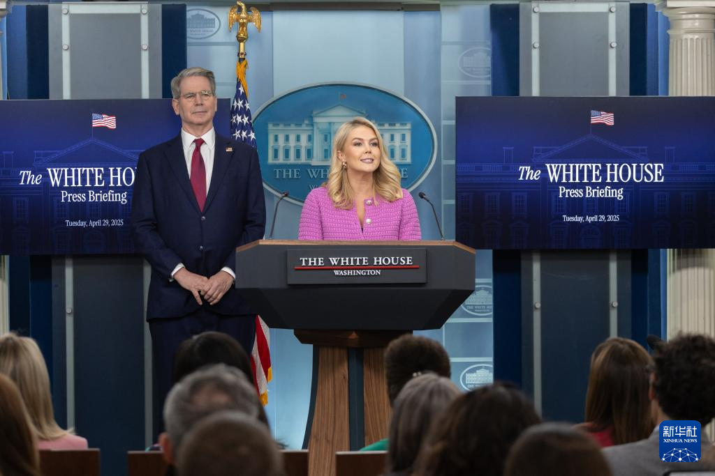 4月29日,美國(guó)白宮新聞秘書卡羅琳·萊維特(右)與美國(guó)財(cái)政部長(zhǎng)斯科特·貝森特在華盛頓白宮出席記者會(huì)。新華社記者 胡友松 攝