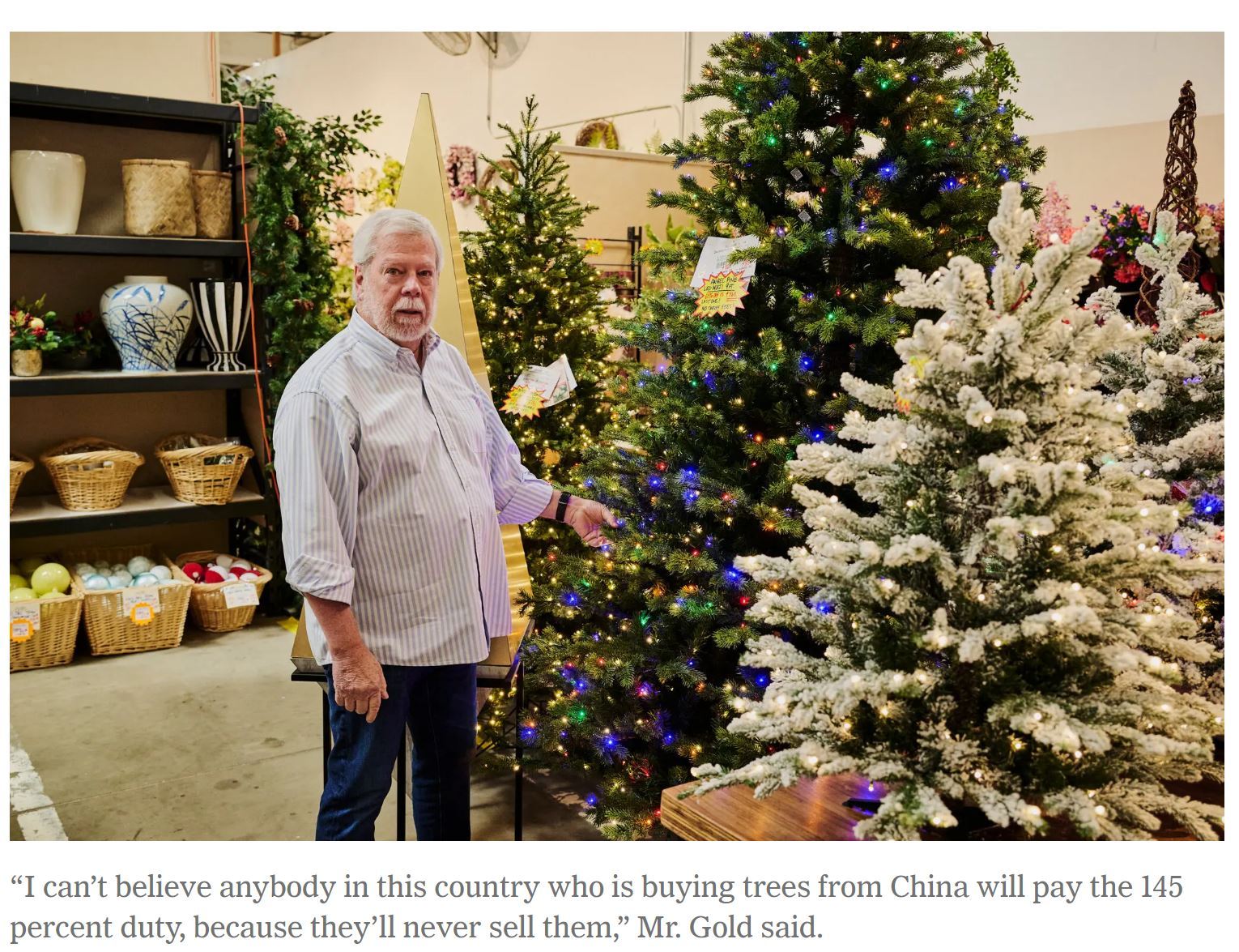 經(jīng)營家居用品的拉里·戈爾德說,去年一棵約2.3米高的圣誕樹在店里的價格大約是1000美元。如今他別無選擇,只能把關(guān)稅成本轉(zhuǎn)嫁給消費者,這將使同樣的一棵樹今年的價格超過2000美元。他無奈地表示,這個價格等于“給產(chǎn)品判了死刑”。