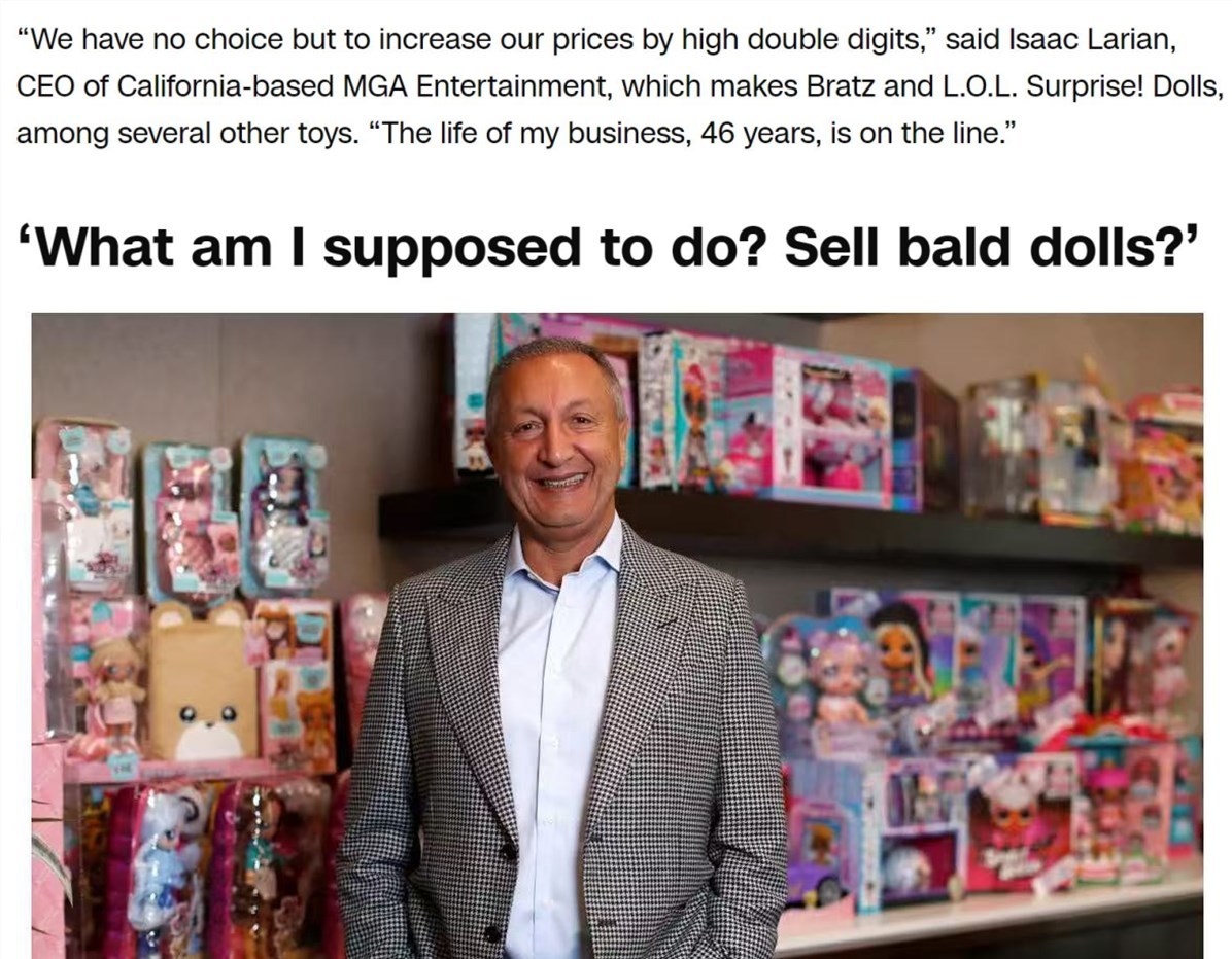 美國玩具生產(chǎn)商及零售商的遭遇和困境只是美國政府關(guān)稅鬧劇傷及本國民眾的一個縮影。