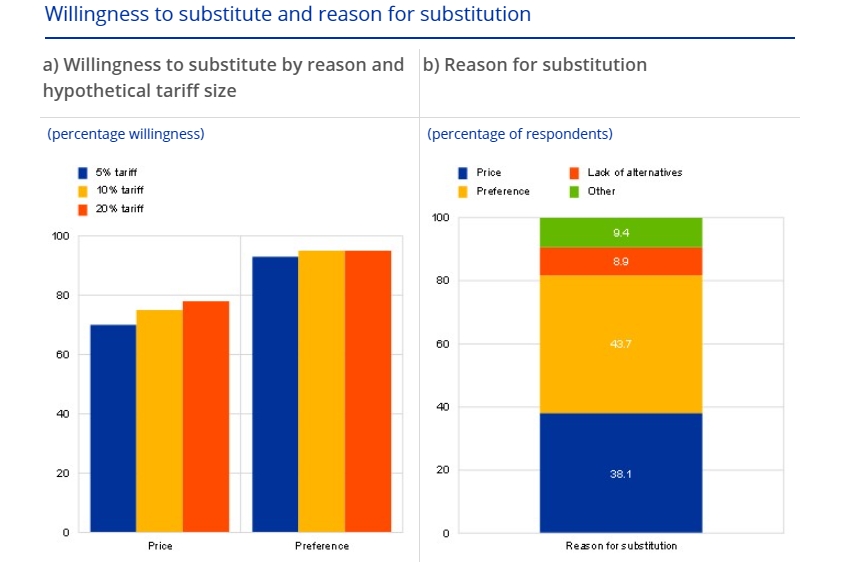 歐洲央行在4月底的博文中還提到,通常情況下,關稅對消費者的影響程度取決于受影響產品和服務的需求價格彈性,即如果價格上漲,消費者可能會轉向更便宜的替代品。然而,近期美國的關稅可能會導致更廣泛的偏好轉變,使歐洲人完全放棄美國產品和品牌,不論價格如何變化。