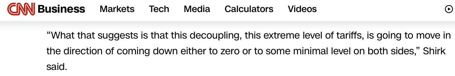美國有線電視新聞網(wǎng)的報道注意到美國財政部長貝森特此前關(guān)于“本周末的談判將側(cè)重于緩和緊張局勢”的表態(tài)。報道援引加州大學圣迭戈分校全球政策與戰(zhàn)略學院研究教授、21世紀中國研究中心名譽主任蘇珊·希爾克的觀點指出,這表明美中之間“脫鉤、極端的關(guān)稅水平,將朝著降至零,或是降至最低水平的方向發(fā)展”。
