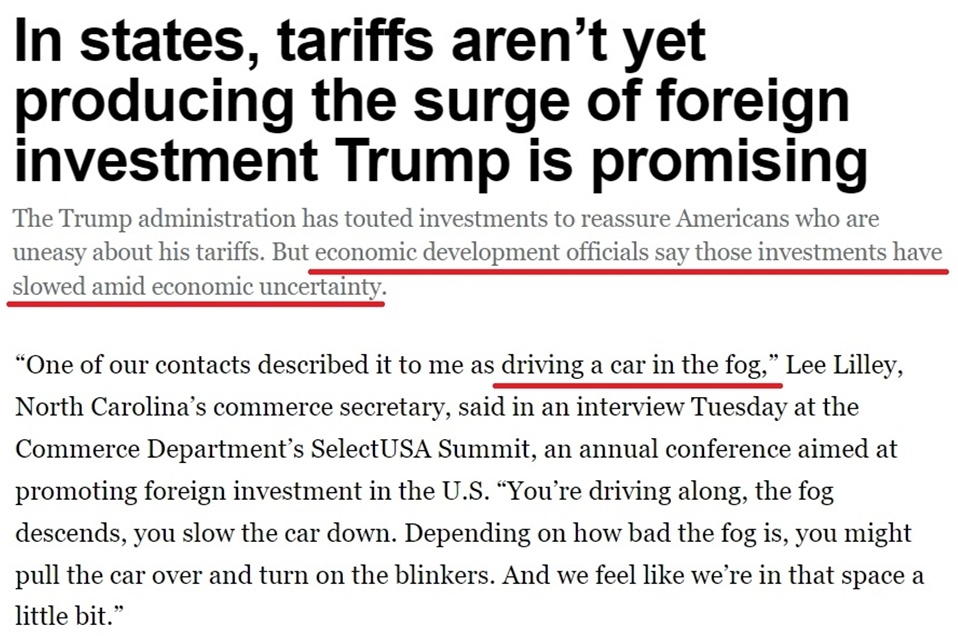 美國政府一直宣稱,加征關(guān)稅將為美國吸引數(shù)萬億美元的外國投資。但據(jù)美國《政治報》報道,來自美國多個州的政府官員和議員都抱怨說,白宮關(guān)稅政策引發(fā)的不確定性正在阻礙外資進(jìn)入美國市場。