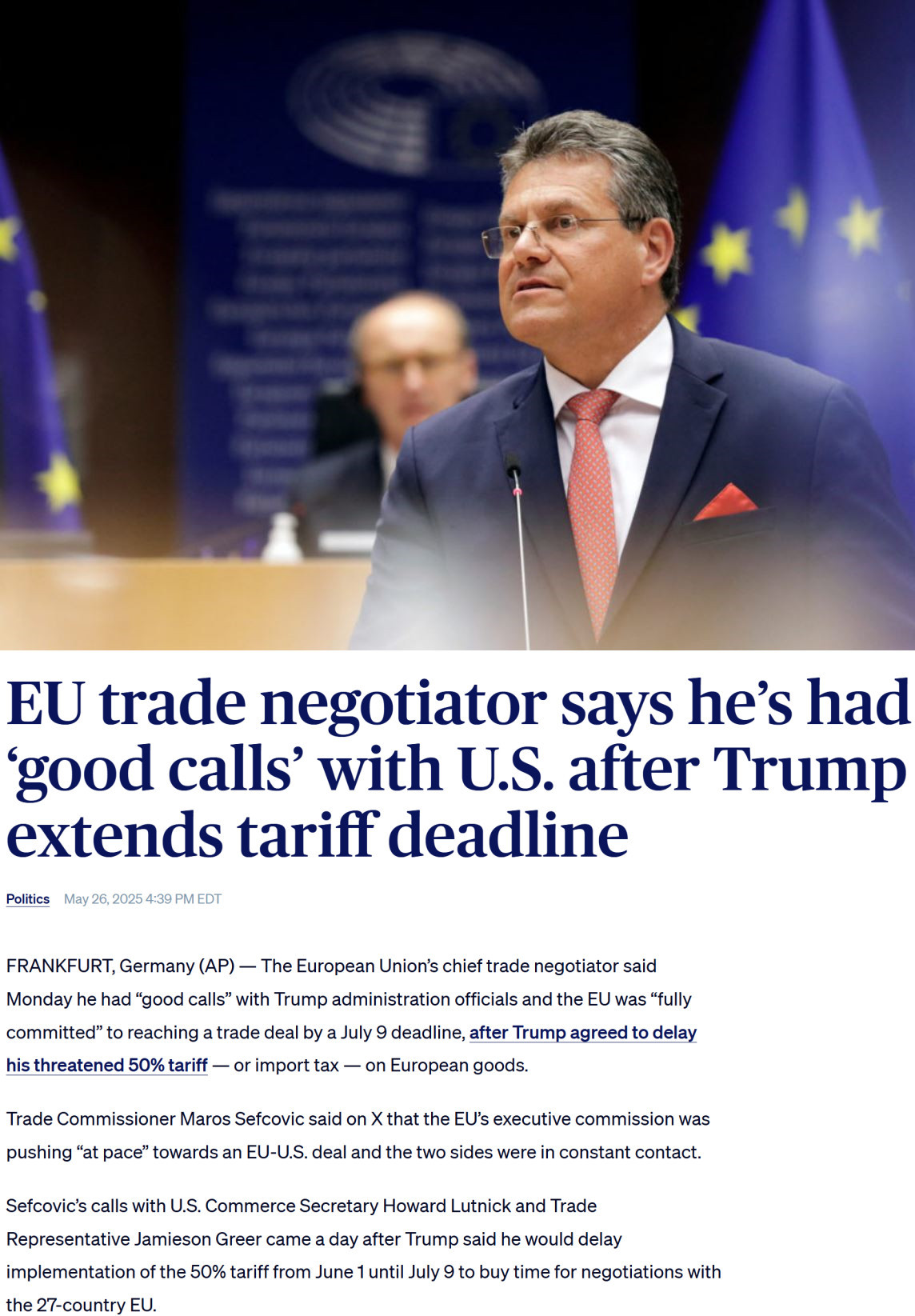 他25日告訴記者,自己當(dāng)天與歐盟委員會主席馮德萊恩“愉快”地通了電話,并應(yīng)對方要求,決定將原計劃從6月1日開始對歐盟加征的50%的關(guān)稅推遲到7月9日,以便雙方有時間就此進(jìn)行談判。