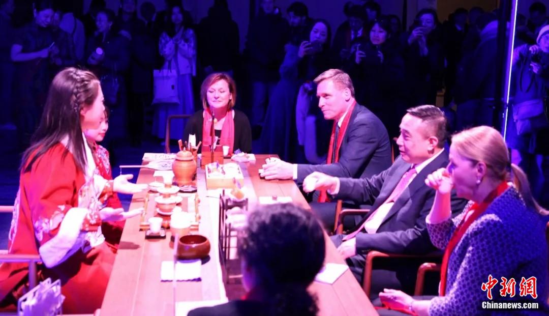 2025年2月13日,中國駐歐盟使團(tuán)在布魯塞爾燈光節(jié)組織“光影茶榭”活動,中國駐歐盟使團(tuán)團(tuán)長蔡潤(右排圖中)邀請嘉賓品茗,體驗中國茶藝。中新社記者 德永健 攝