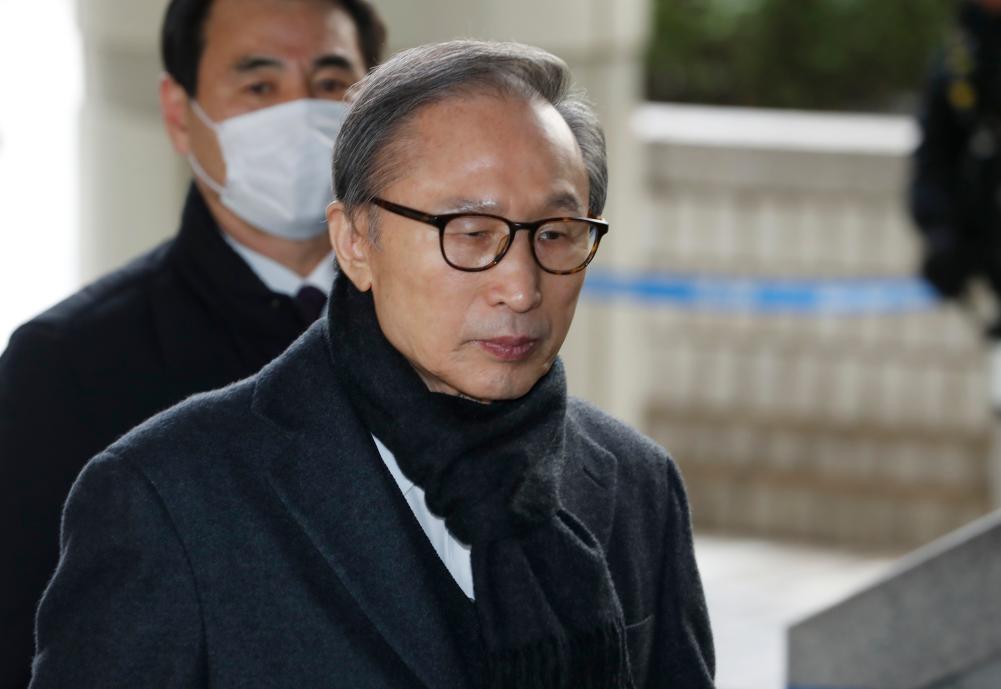 圖為2020年2月19日,李明博(前)抵達(dá)韓國(guó)首爾高等法院。新華社/紐西斯通訊社