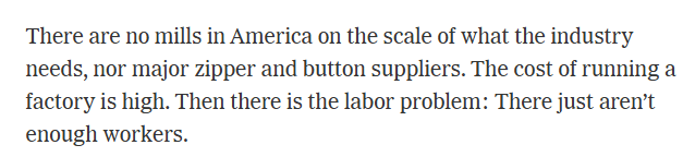 文章說,特朗普政府的高額關稅給企業(yè)帶來了巨大壓力,迫使企業(yè)的負責人一直在思考自己能在美國多生產多少產品。但是,美國既沒有滿足該行業(yè)需求的規(guī)模工廠,也沒有主要的拉鏈和紐扣供應商。運營工廠的成本很高。此外還有勞動力問題:工人根本不夠用。