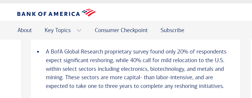美國美銀證券(BofA Securities)6月發(fā)布的最新報(bào)告指出,盡管美國政府以“保護(hù)本土企業(yè)、保障就業(yè)”為由祭出關(guān)稅大棒,鼓勵(lì)企業(yè)將生產(chǎn)線遷回本土,但企業(yè)在重新布局全球供應(yīng)鏈時(shí),主要考量的因素已不再是成本,回流美國制造的意愿有限。