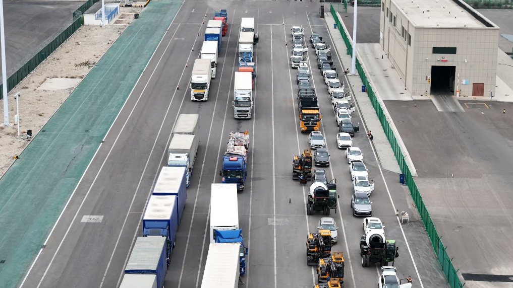 在霍爾果斯公路口岸,貨車、商品車、工程車等排成長龍,從中國駛向哈薩克斯坦。