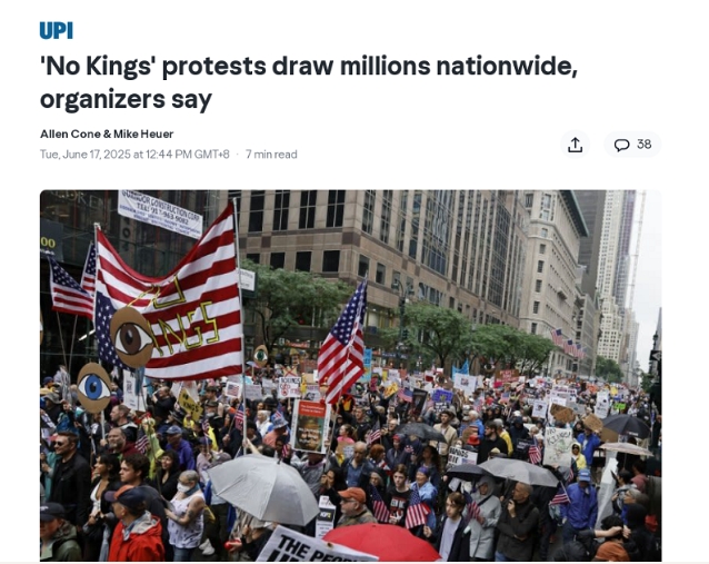 據(jù)美國合眾國際社(UPI)6月17日報(bào)道,上個(gè)周末,全美多地爆發(fā)約2000場名為“不要國王”(No Kings)的抗議活動(dòng),組織者稱參與人數(shù)達(dá)數(shù)百萬。