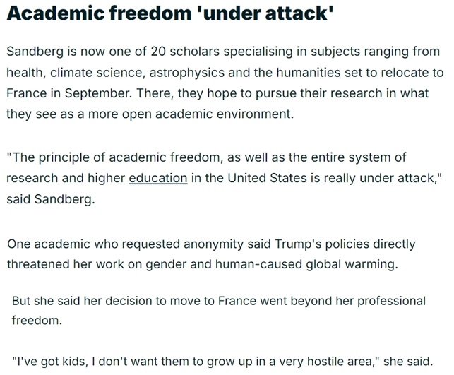還有一位女學者告訴媒體,美國現(xiàn)政府的政策直接威脅到她有關(guān)氣候變暖等方面的研究工作,她搬到法國不僅是為了學術(shù)自由,還是因為不想讓自己的孩子“在一個充滿敵意的地方長大”。