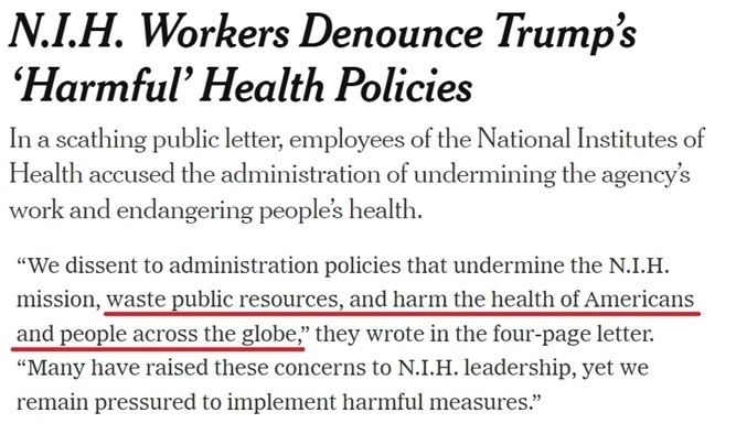 近日,NIH近百名現(xiàn)任和新近被解職的職員發(fā)表聯(lián)名信,批評美國現(xiàn)政府“有害”的衛(wèi)生政策危害美國和全球人民的健康,將科學研究政治化并浪費公共資源。