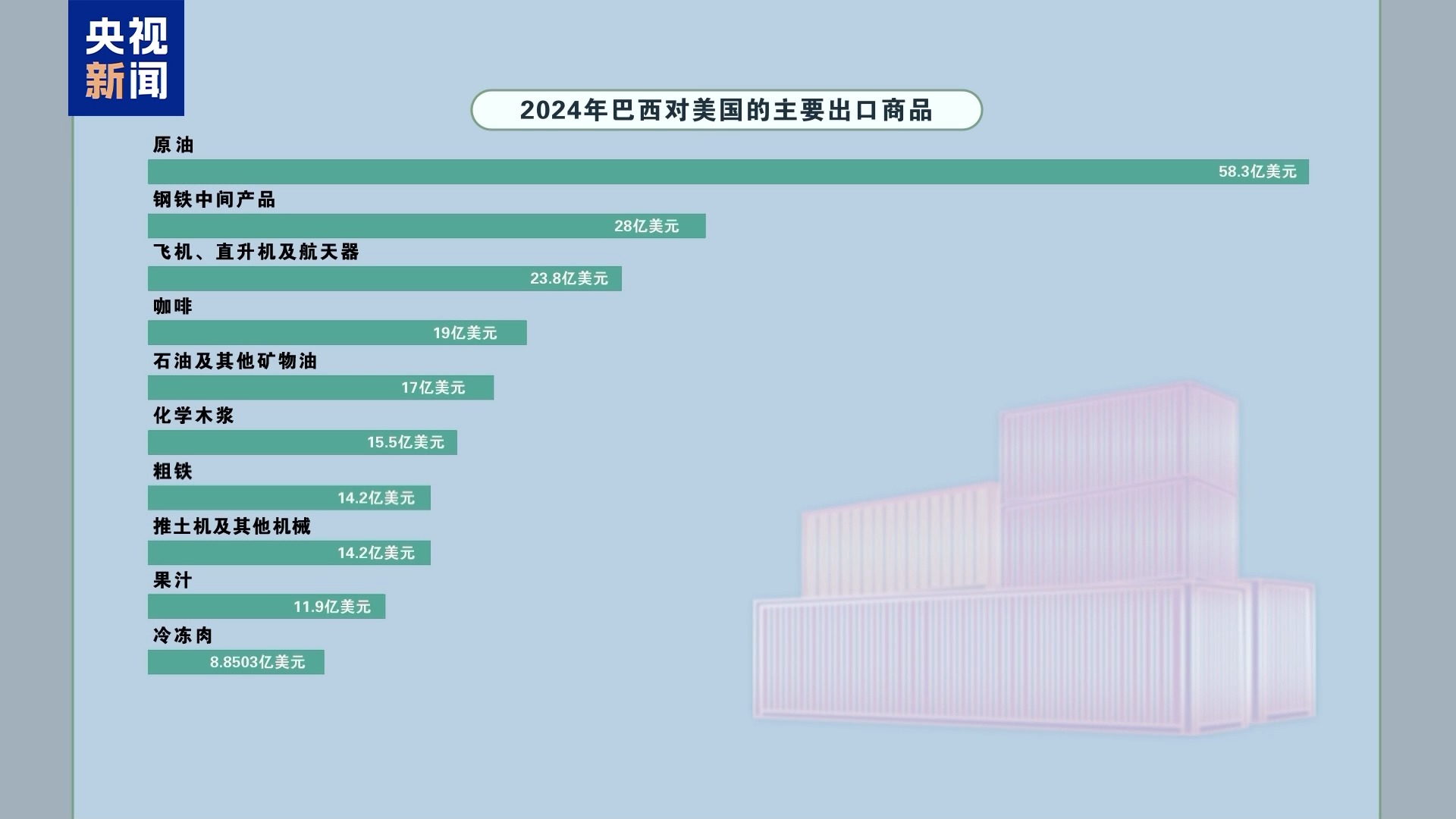 美國有線電視新聞網(wǎng)報(bào)道稱,2024年,巴西向美國出口了總額高達(dá)404億美元的商品??Х取⒐?、冷凍肉等美國民眾日常食物以及原油、粗鐵等基礎(chǔ)化工及能源商品都在排名前十內(nèi)。
