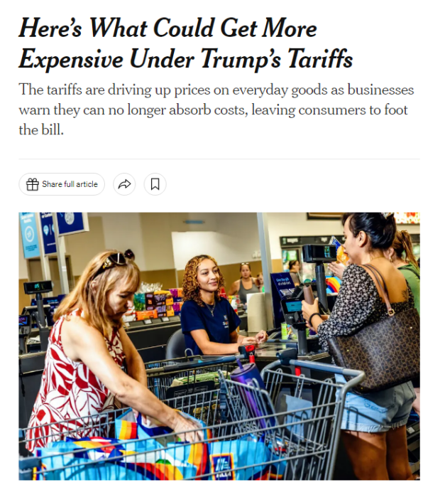 美國政府此前公布的經(jīng)過調(diào)整的“對等關(guān)稅”已經(jīng)生效,美數(shù)十個貿(mào)易伙伴將被征收10%至41%不等的關(guān)稅,隨之而來的便是被關(guān)稅推高的物價。美國《紐約時報》刊文稱,美國消費者或許很快就會發(fā)現(xiàn),大到汽車,小到一雙鞋和一根香蕉,幾乎所有商品的售價都會上漲。