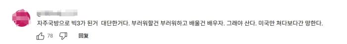 有韓國網(wǎng)友表示,對中國除了羨慕還是羨慕,韓國一定要向中國學(xué)習,如果(韓國)只看美國的眼色,就會“亡國”。
