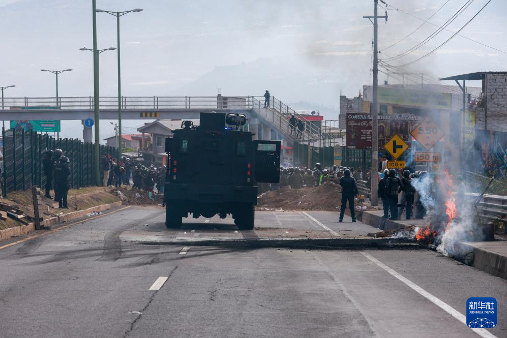 9月16日,在厄瓜多爾首都基多,武裝部隊人員在公路旁維持秩序。新華社發(fā)(里卡多·蘭德塔攝)