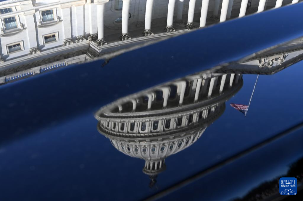 這是10月1日在美國首都華盛頓拍攝的美國國會大廈倒影。新華社記者 李睿 攝