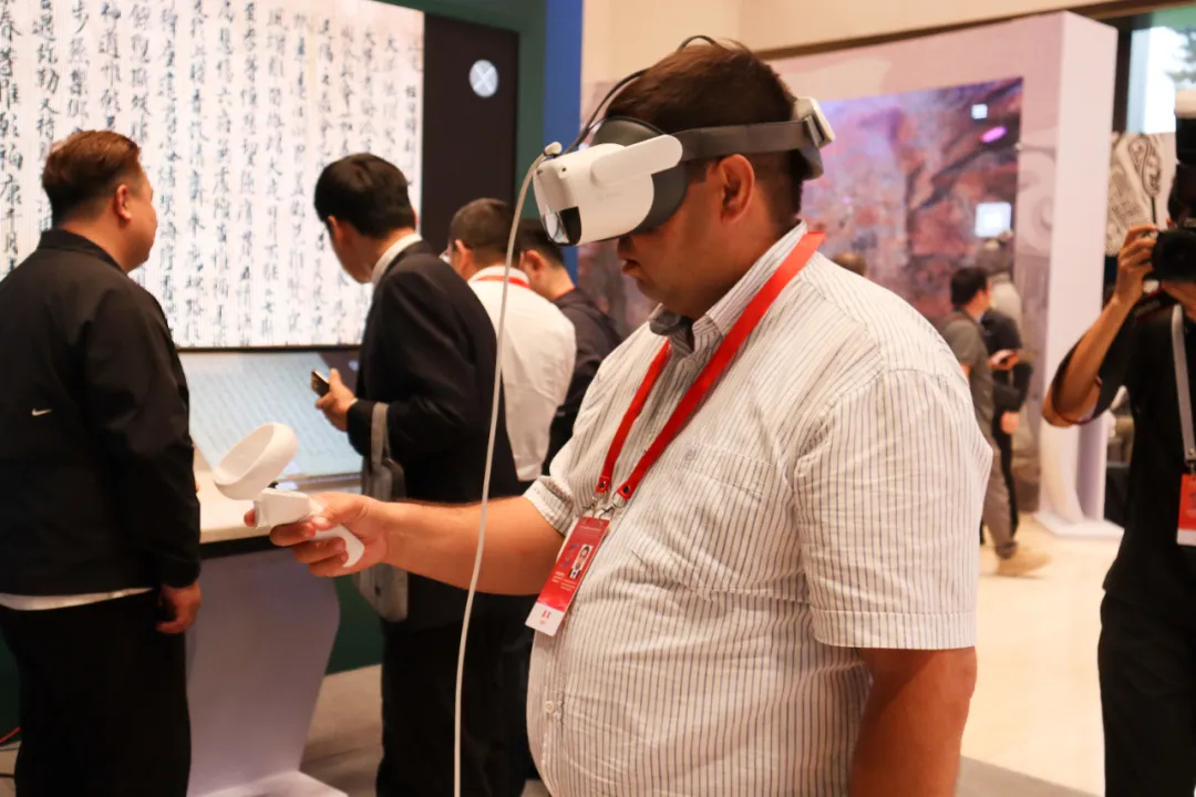 2025年9月17日,陜西西安,2025年世界互聯(lián)網(wǎng)大會文化遺產(chǎn)數(shù)字化論壇開幕。圖為外籍參會者體驗數(shù)字化項目。中新社記者 李一璠 攝