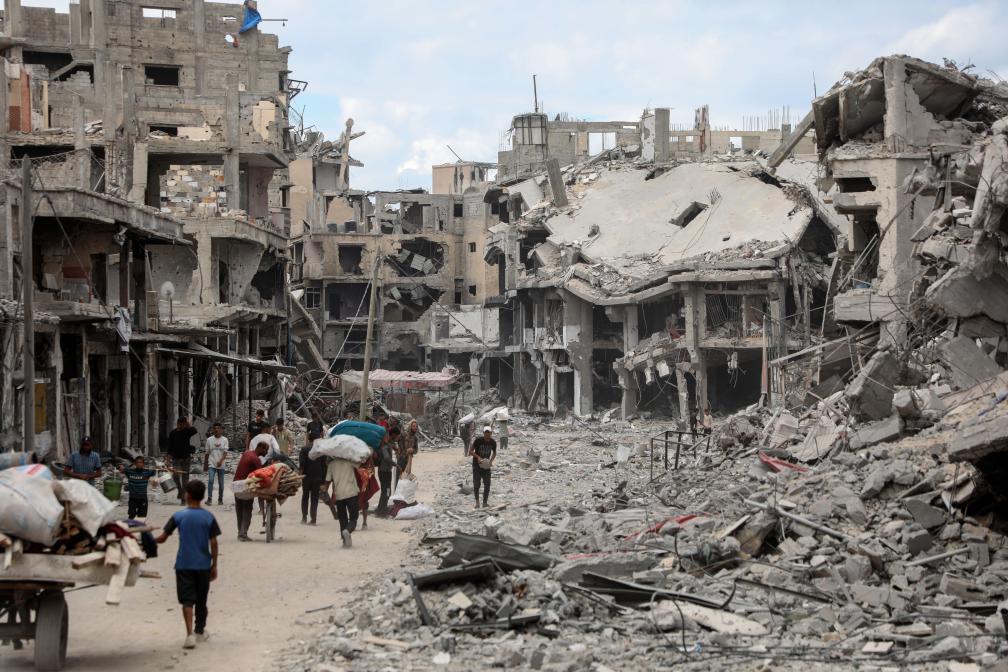 10月12日,在加沙地帶南部汗尤尼斯,重返家園的巴勒斯坦人走過嚴(yán)重受損的建筑。新華社發(fā)(里澤克·阿卜杜勒賈瓦德攝)