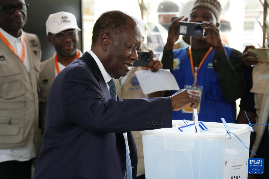 10月25日,在科特迪瓦經(jīng)濟(jì)首都阿比讓的一處投票站,科特迪瓦現(xiàn)任總統(tǒng)阿拉薩內(nèi)·瓦塔拉將選票放入投票箱。新華社記者 張健 攝