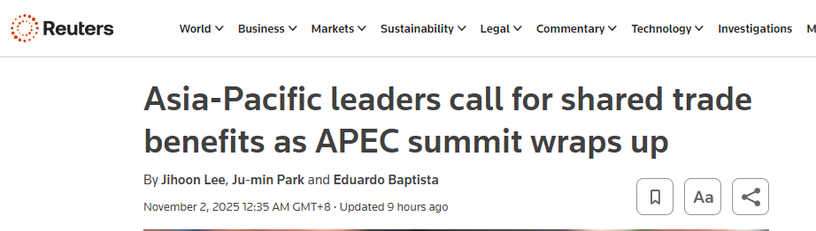 2025年亞太經(jīng)合組織(APEC)領(lǐng)導(dǎo)人非正式會議于10月31日至11月1日在韓國慶州舉行,會議發(fā)表了《慶州宣言》。多家外媒報道稱,會議凸顯了亞太地區(qū)經(jīng)濟體對自由貿(mào)易的承諾。