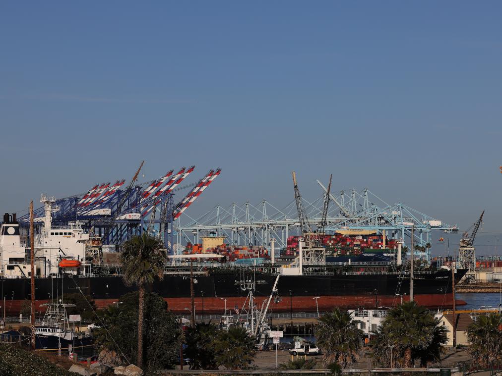 這是5月10日在美國(guó)洛杉磯港拍攝的貨船。新華社發(fā)邱晨攝