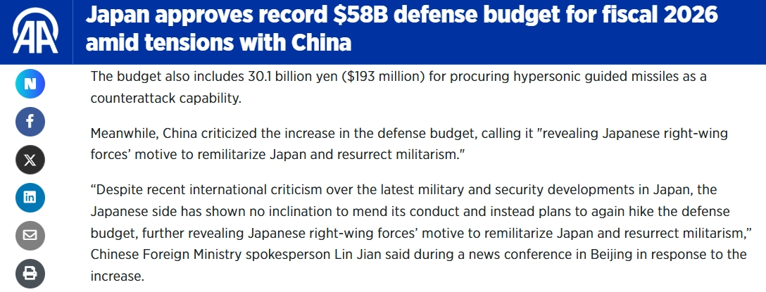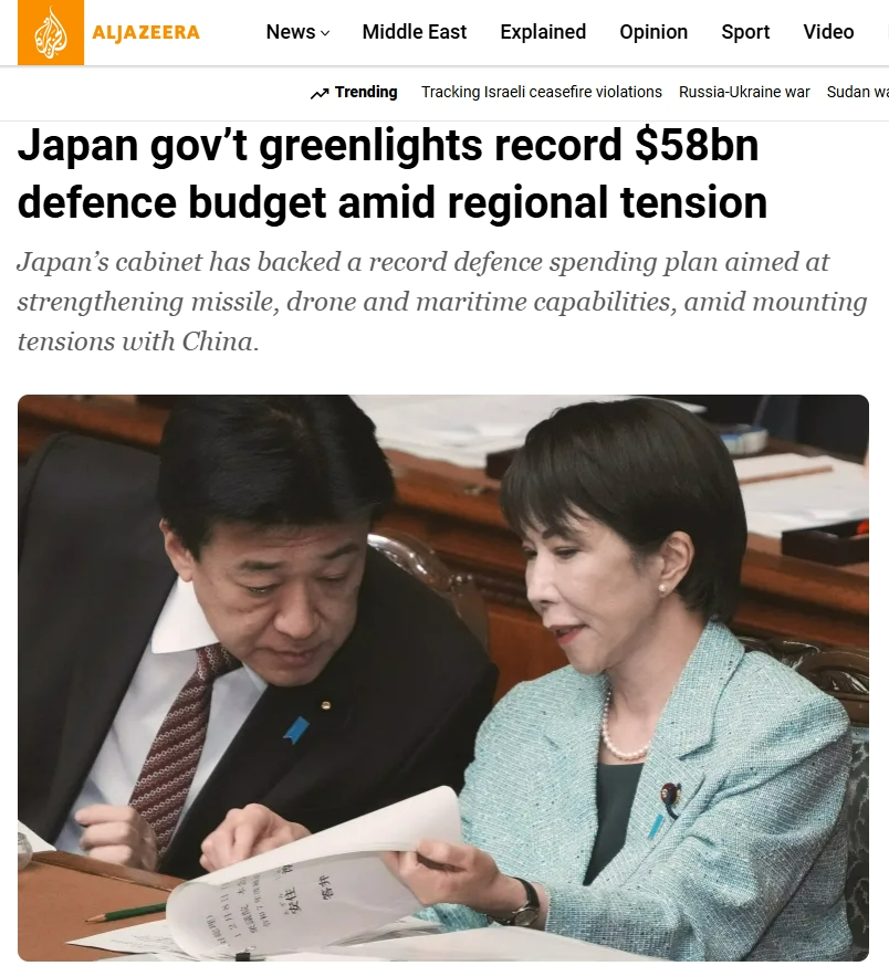 日本政府12月26日批準(zhǔn)2026財(cái)年(2026年4月至2027年3月)預(yù)算案,其中防衛(wèi)預(yù)算超9萬億日元,再創(chuàng)歷史新高。其展現(xiàn)出的日本負(fù)面軍事動(dòng)向,受到國(guó)際媒體關(guān)注。