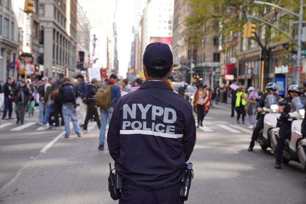 2025年10月18日,在美國紐約,警察在示威游行活動現場執(zhí)勤。新華社記者張鳳國攝