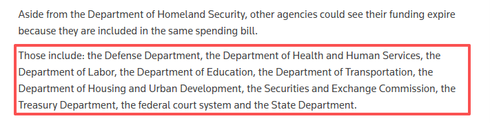 據(jù)路透社報(bào)道,美國(guó)國(guó)會(huì)每年需為438個(gè)聯(lián)邦機(jī)構(gòu)撥款,若未能履行該職責(zé),相關(guān)機(jī)構(gòu)必須停止所有非必要工作。此次部分“停擺”涉及多個(gè)關(guān)鍵部門(mén),包括美國(guó)衛(wèi)生與公眾服務(wù)部、交通部、證券交易委員會(huì)、財(cái)政部、聯(lián)邦法院系統(tǒng)等。