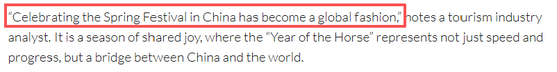 報(bào)道認(rèn)為,春節(jié)是一個(gè)共享歡樂的節(jié)日,馬年所象征的不僅是迅捷與進(jìn)步,更是一座連接中國(guó)與世界的橋梁。一位旅游分析師在報(bào)道中表示:“在中國(guó)過春節(jié)已成為一種全球時(shí)尚?!?/strong>