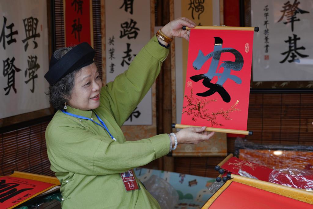 2月12日,在越南首都河內(nèi)的新春書法節(jié)現(xiàn)場,一名書法家展示漢字書法作品。新華社記者 劉潁 攝