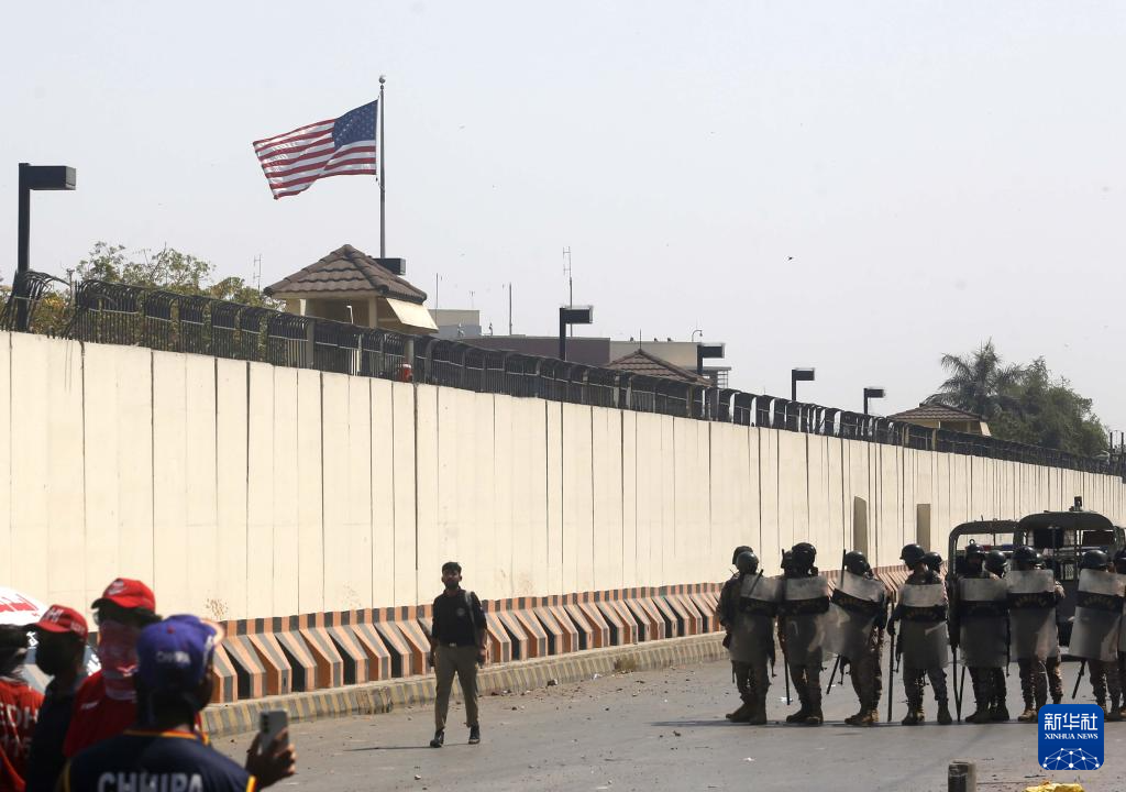 3月1日,執(zhí)法人員(畫(huà)面右側(cè))在巴基斯坦南部城市卡拉奇的美國(guó)駐卡拉奇領(lǐng)事館外控制局勢(shì)。新華社發(fā)(伊姆蘭·阿里攝)