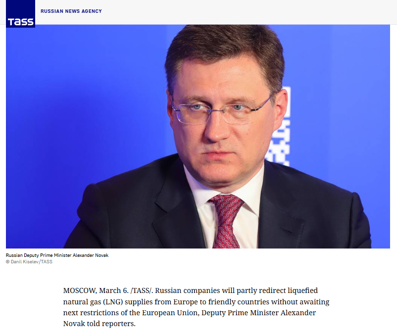 當(dāng)?shù)貢r(shí)間3月6日,俄羅斯副總理諾瓦克表示,俄羅斯企業(yè)近期將把部分供應(yīng)歐洲的液化天然氣轉(zhuǎn)向其他有需求的國家。