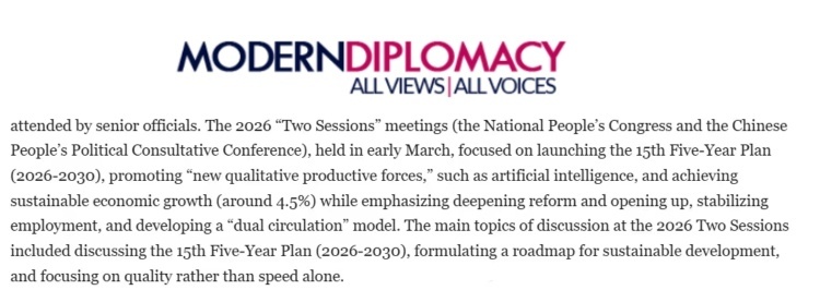 歐洲《現(xiàn)代外交》網(wǎng)站近日刊登埃及本尼蘇伊夫大學(xué)副教授納迪亞·赫爾米博士的評(píng)論文章稱,今年中國(guó)兩會(huì)重點(diǎn)關(guān)注發(fā)展模式創(chuàng)新與深化伙伴關(guān)系。會(huì)議議題包括通過(guò)共建“一帶一路”倡議推動(dòng)“高質(zhì)量發(fā)展”,深化數(shù)字經(jīng)濟(jì)、基礎(chǔ)設(shè)施及能源領(lǐng)域的國(guó)際合作,為推動(dòng)構(gòu)建人類命運(yùn)共同體提供重要平臺(tái)。