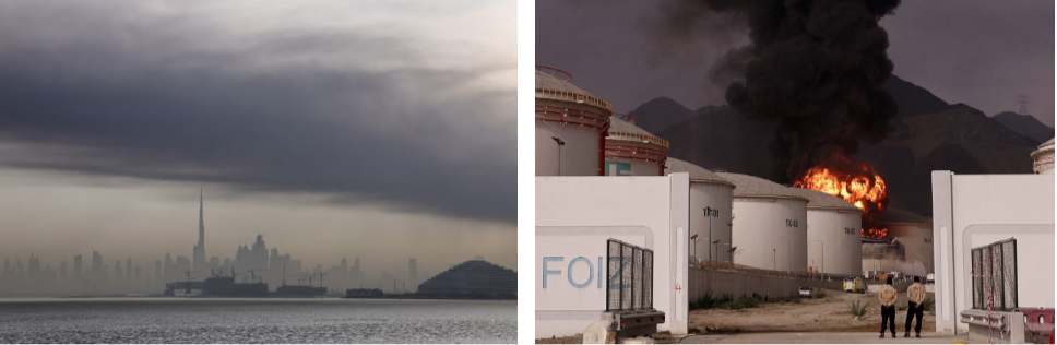 左圖:當地時間13日,迪拜上空冒起濃煙 右圖:阿聯酋富查伊拉一處石油工業(yè)區(qū)14日遭受襲擊發(fā)生火災 圖源:法新社、路透社