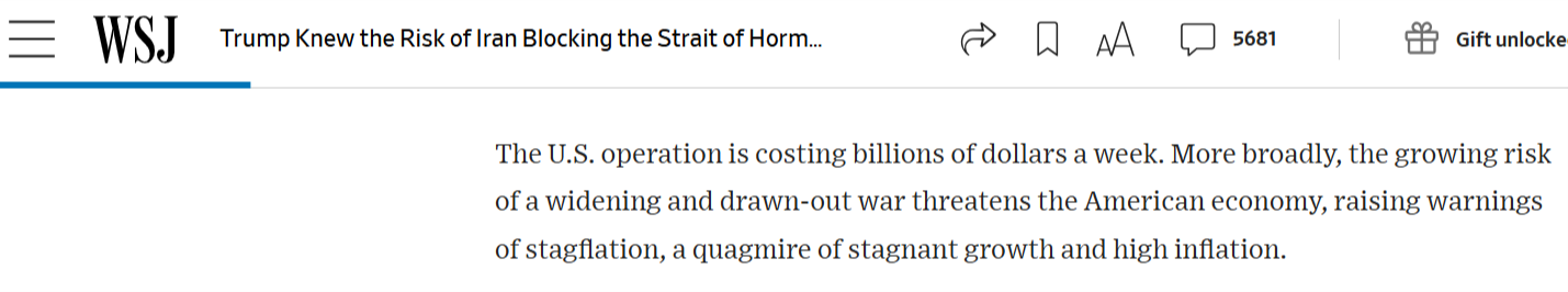 盟友之外,美國民眾也在為這場軍事行動“埋單”?!度A爾街日報》的報道稱,美國國務院直到戰(zhàn)爭開始后才敦促美國公民離開該地區(qū)國家或撤離部分大使館。而當時,商業(yè)空域已關閉,數萬美國人滯留中東,美國的外交官們在部分大使館也處于危險之中;此外,美國此次軍事行動每周耗資數十億美元。戰(zhàn)爭不斷擴大且長期延宕的風險日益加劇,正威脅著美國經濟,甚至引發(fā)“滯脹”風險。