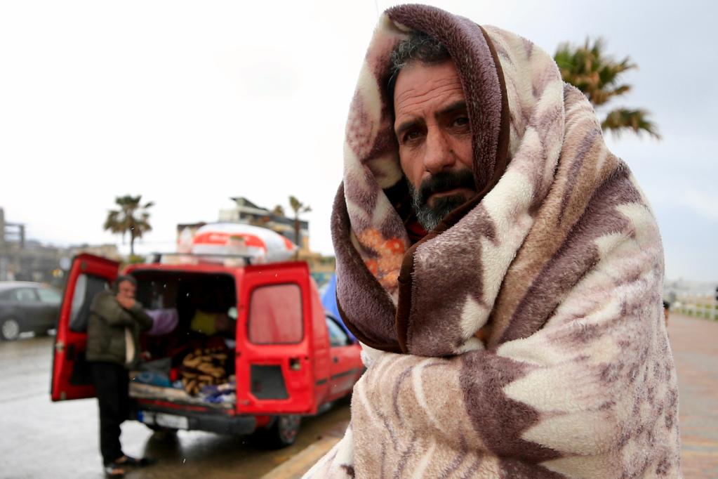 3月15日,在黎巴嫩南部賽達(dá)市附近的一條公路旁,一名黎巴嫩流離失所者用毯子御寒。新華社發(fā)(阿里·哈希紹攝)