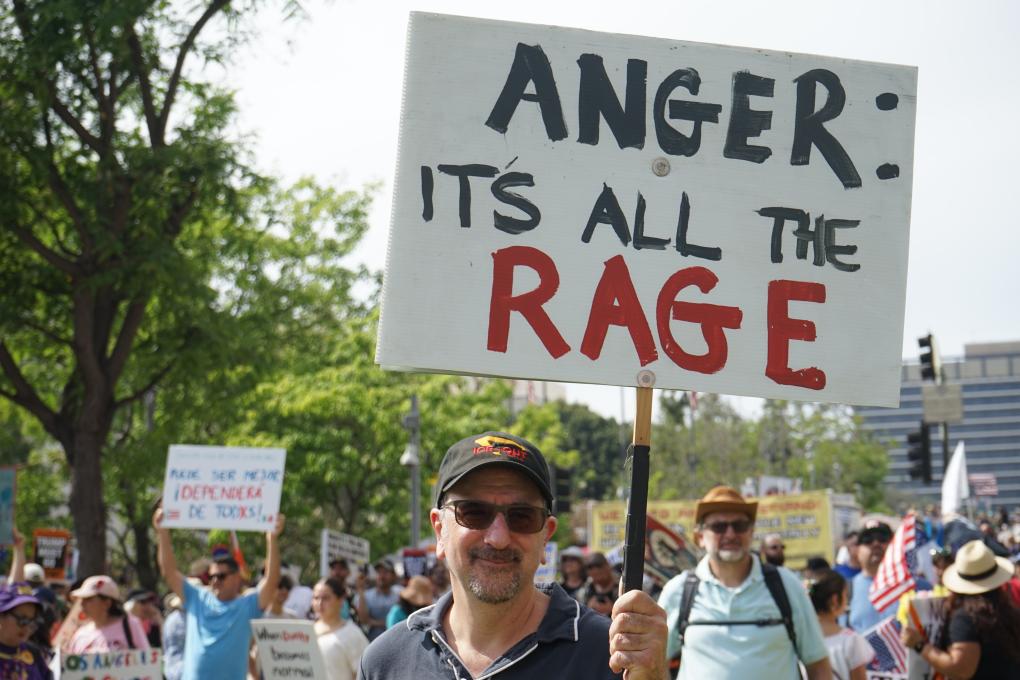 3月28日,人們在美國加利福尼亞州洛杉磯參加“不要國王”抗議活動。新華社發(fā)(曾慧攝)