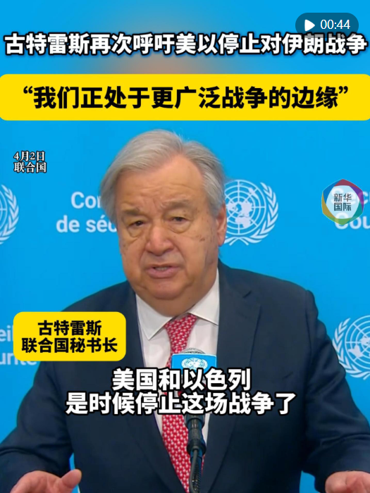 聯(lián)合國秘書長古特雷斯2日對(duì)媒體發(fā)表講話,再次呼吁美國和以色列停止針對(duì)伊朗的戰(zhàn)爭,同時(shí)呼吁伊朗停止攻擊鄰國。