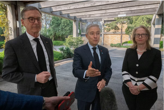 加拿大央行行長(zhǎng)蒂夫·麥克勒姆(左)、加拿大財(cái)政部部長(zhǎng)商鵬飛(中)、加拿大駐華大使梅倩琳(右)