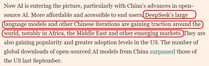 在人工智能領(lǐng)域,文章提到,以DeepSeek為代表的中國(guó)開(kāi)源大模型正不斷擴(kuò)大海外影響力。憑借更低的成本與更易獲取的使用門(mén)檻,中國(guó)大語(yǔ)言模型在非洲、中東等新興市場(chǎng)受到廣泛關(guān)注。文章稱(chēng),相關(guān)模型應(yīng)用增加后,可能進(jìn)一步帶動(dòng)預(yù)測(cè)性維護(hù)、數(shù)據(jù)分析和智慧基礎(chǔ)設(shè)施管理等服務(wù)需求,從而對(duì)知識(shí)密集型服務(wù)出口形成支撐。