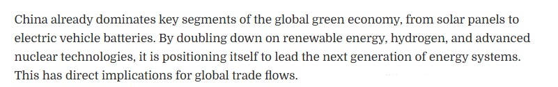 文章關(guān)注到,該規(guī)劃綱要將綠色發(fā)展置于中國(guó)經(jīng)濟(jì)轉(zhuǎn)型的核心位置。中國(guó)已在全球綠色經(jīng)濟(jì)的關(guān)鍵領(lǐng)域占據(jù)主導(dǎo)地位,從太陽(yáng)能電池板到電動(dòng)汽車(chē)電池,無(wú)一例外。通過(guò)加大對(duì)可再生能源、氫能以及先進(jìn)核能技術(shù)的投入,中國(guó)正致力于成為下一代能源體系的引領(lǐng)者。這將對(duì)全球貿(mào)易格局產(chǎn)生直接影響。