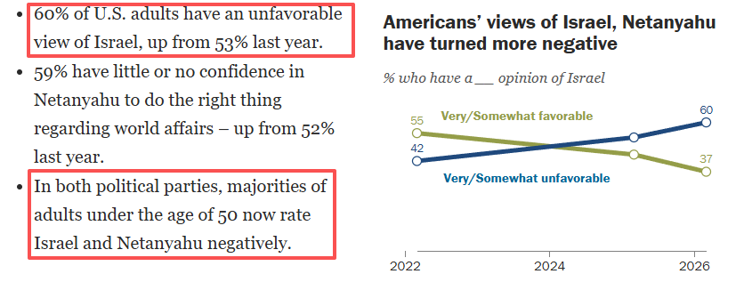 民意層面,皮尤研究中心近期的民調(diào)結(jié)果顯示,60%的美國成年人對以色列持負(fù)面看法,高于去年的53%。無論黨派歸屬,50歲以下成年人中的大多數(shù)受訪者對以色列及其總理內(nèi)塔尼亞胡的評價都是負(fù)面的。