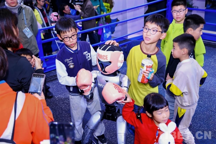 圖為小朋友們競相與機(jī)器人拳手互動。
