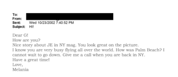 然而,梅拉尼婭所提及的那封電子郵件,開篇便以“親愛的G!”相稱,內(nèi)容涉及對(duì)紐約某雜志一篇報(bào)道“JE”文章的稱贊,并提及一張麥克斯韋現(xiàn)身其中的照片。郵件中,梅拉尼婭還詢問了麥克斯韋近期棕櫚灘之行的情況,末尾更建議尚未因性販運(yùn)罪身陷囹圄的麥克斯韋,下次來紐約時(shí)務(wù)必聯(lián)系她。落款赫然寫道:“愛你的,梅拉尼婭。”