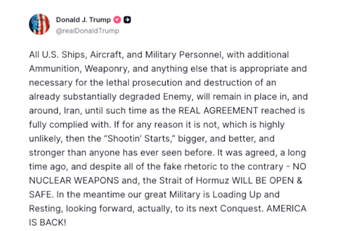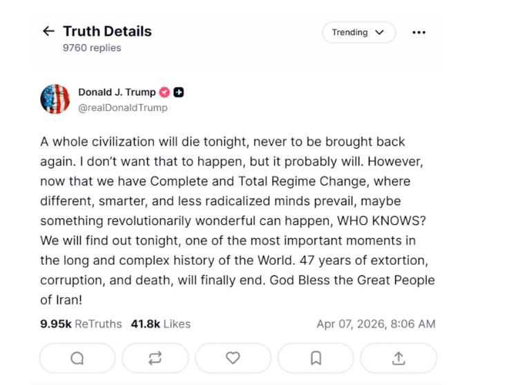 特朗普在真實(shí)社交平臺(tái)發(fā)布的貼文,發(fā)文威脅伊朗稱,“今晚,整個(gè)文明將消亡”