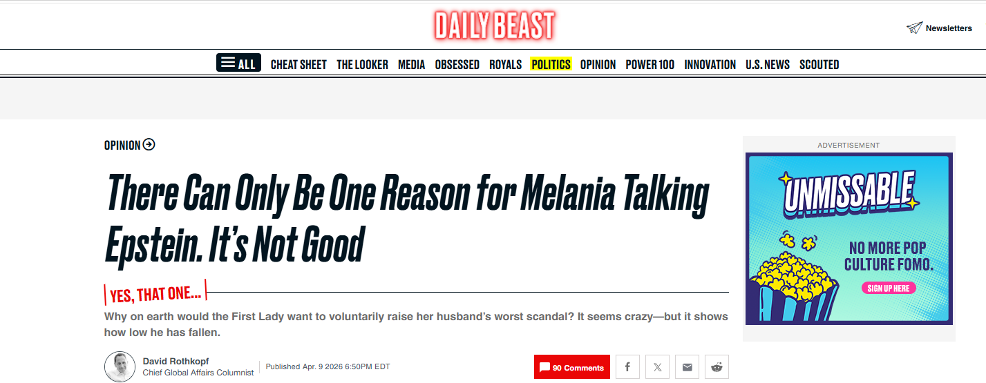 美國新聞網(wǎng)站《每日野獸》4月9日刊發(fā)題為《梅拉尼婭就愛潑斯坦案發(fā)聲只有一個(gè)原因,這原因可不妙》的評(píng)論性文章,作者是大衛(wèi)·羅斯科夫(David Rothkopf),文章摘編如下: